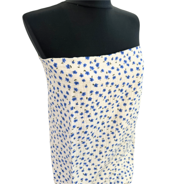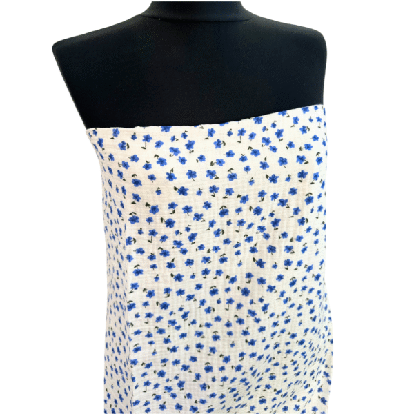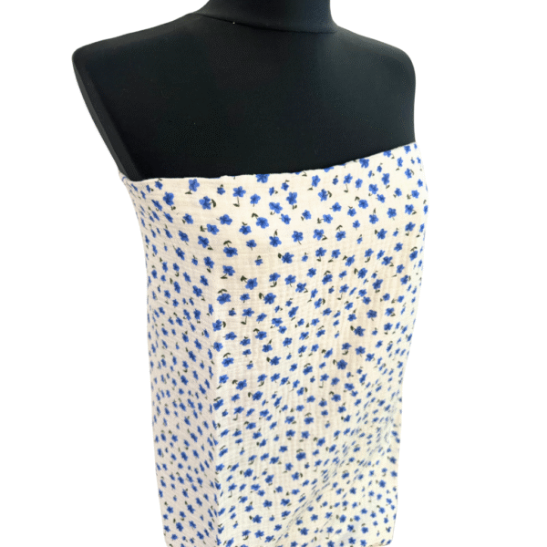 Bumbac Gofrat cunoscut ca si Muselina Imprimata cu flori albastre.