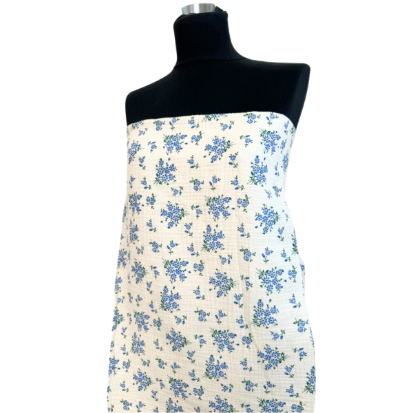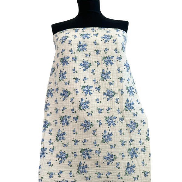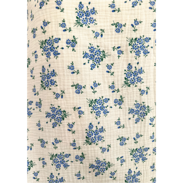 Bumbac Gofrat cunoscut ca si Muselina Imprimata cu flori mici albastre in buchetele.