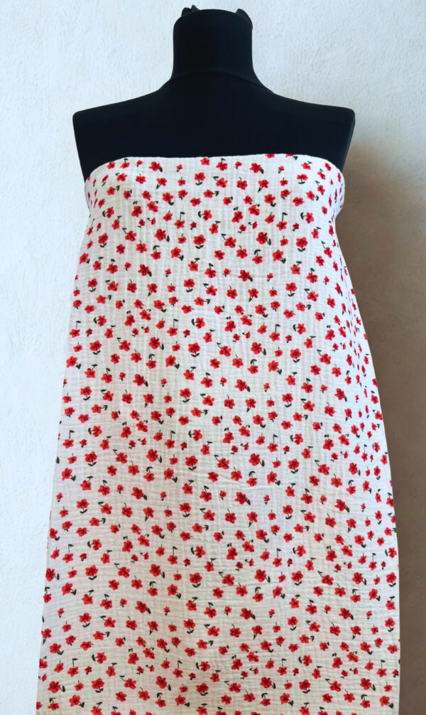 Bumbac Gofrat cunoscut ca si Muselina Imprimata cu flori mici rosii.