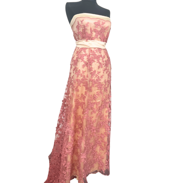 Această combinație între broderie și accente tridimensionale adaugă un plus de eleganță fiecărui proiect. Țesătura este ușoară, vaporoasă, potrivită pentru creații couture, sau alte articole vestimentare care cer un impact vizual deosebit.