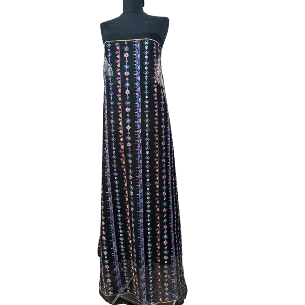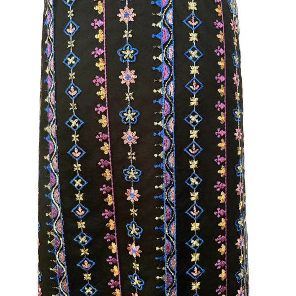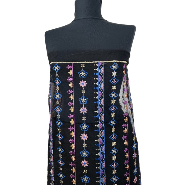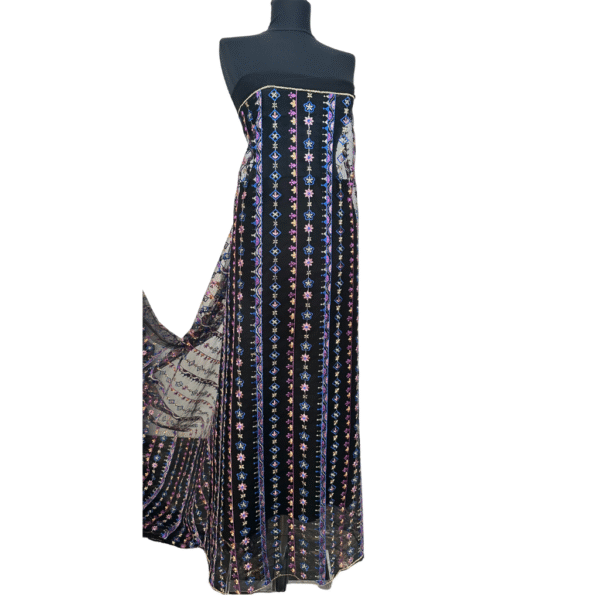 Această dantelă brodată pe tulle negru redefinește rafinamentul prin combinația de texturi delicate și broderii spectaculoase. Realizată din benzi de broderie acestea ajuta designerul sa creeze ceva deosebit. In articolele vestimentare benzile pot fi dispuse atât vertical, cât și orizontal. Astfel orice piesa vestimentara se va remarca printr-un design jucăuș și original. Fiecare bandă are un model diferit, ceea ce conferă materialului un caracter unic, ideal pentru creații vestimentare deosebite.