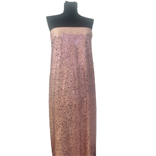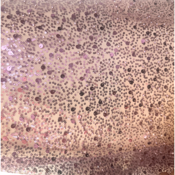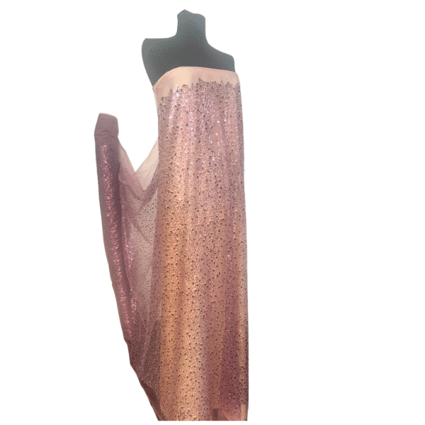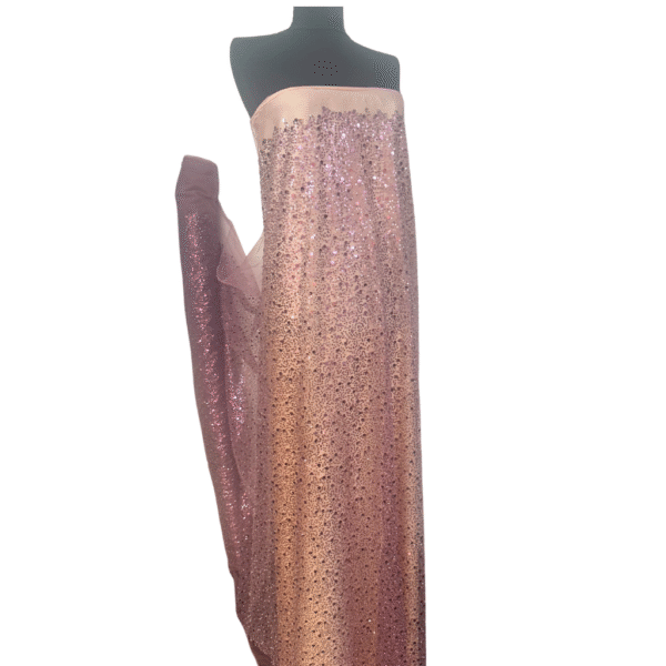Aceasta tesatura ,are la bază un **tulle fin, de culoare roz pudra**, decorat cu **paiete mari și mici** alături de **mărgeluțe strălucitoare**, toate într-o nuanță uniformă de roz pudra, ce oferă un efect sofisticat și armonios. Jocul subtil de lumini creează un aspect spectaculos, ideal pentru ținute care ies în evidență prin eleganță și feminitate.