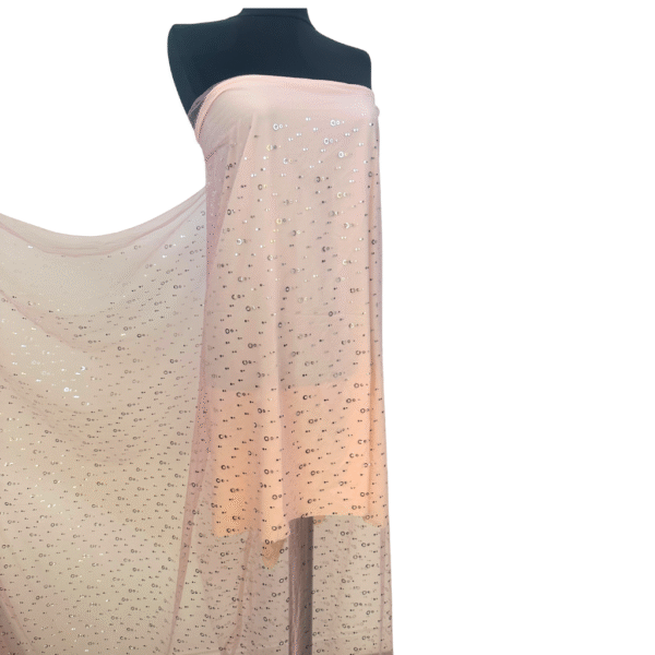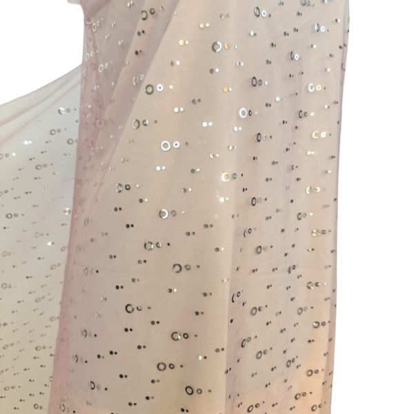 Tulle roz accesorizat cu aplicatii rotunde argintii este ideal pentru rochii de gala, rochii de cununie civila sau orice articol vestimetar cu aer rafinat si boem.