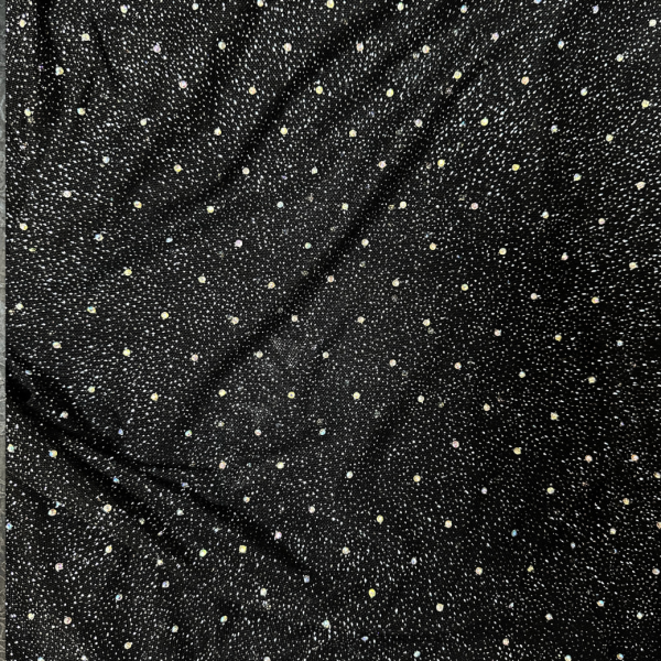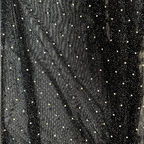 Tulle plin elastic negru cu sclipici și strasuri este o țesătură elegantă și strălucitoare, ideală pentru inserții spectaculoase în rochii (mâneci, spate, partea superioară) sau pentru realizarea unei rochii îndrăznețe și sofisticate.